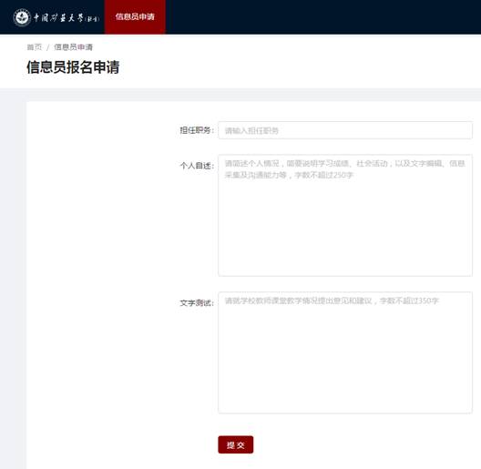 1.有意愿、符合条件的学生请于9月27日前登录中国矿业大学(北京)学生教学信息员管理系统(https://jwczj.cumtb.edu.cn:85/b/)进行报名。系统具体操作流程见附件1。