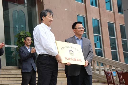 中国矿业大学(北京)王家臣副校长向都安高中授予“优质生源基地”牌匾,教务处处长、招生办公室主任刘波与都安高中校长蓝志标共同签署合作协议书。
