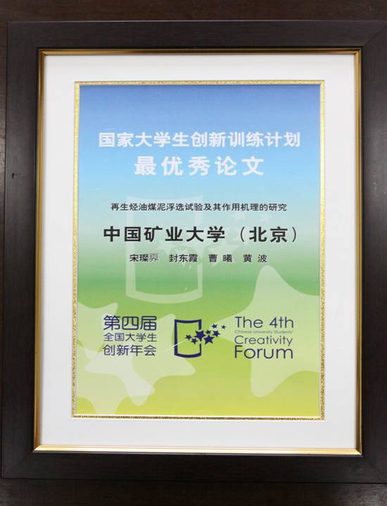 我校2007级矿物加工工程专业本科生宋璨奡、曹曦、封东霞为主要作者撰写的论文《再生烃油煤泥浮选试验及其作用机理的研究》荣获“第四届全国大学生创新年会”颁发的“国家大学生创新训练计划最优秀论文奖”,该论文是宋璨奡等同学在化环学院黄波老师指导下,参加国家大学生创新性实验计划“再生烃油制备煤泥浮选药剂的研究”项目取得的研究成果。