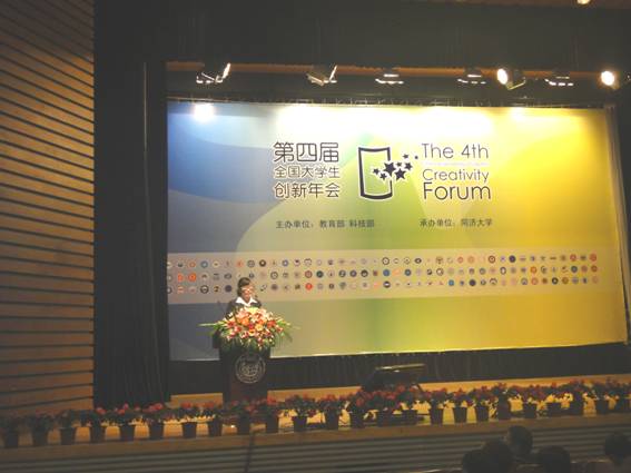 “第四届全国大学生创新年会”是由教育部、科技部主办,同济大学承办并于2011年10月22至23日在上海同济大学隆重举行。年会主要包括大学生学术研究论文交流、大学生创新展板与成果展示、大学生创新思维与创新方法类课程建设研讨、大学生创新训练教师论坛等各项会议内容。来自全国120所“全国大学生创新性实验计划”实施高校的300余师生代表参加了本次论坛。我校教务处有关老师及项目论文学生代表参加了本届年会。