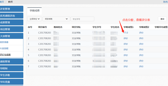 (2)查询:点击分数可以查询评价表,点击“导出”,生成评价表。