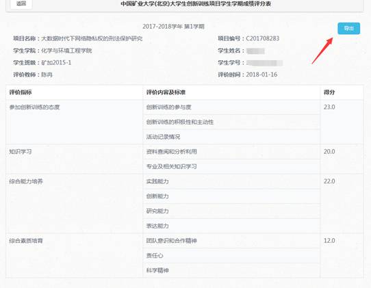 如果导师评价了,则显示对应的分数,点击分数,查阅评价表,在评价表界面点击“导出”,导出评价表。